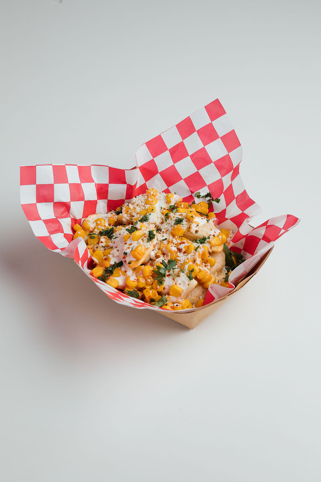 Crispy fried potato & cheese pierogi piled high with sweet street corn, cool crema, crumbled cotija, a sprinkle of Tajín, fresh cilantro, and a squeeze of lime.