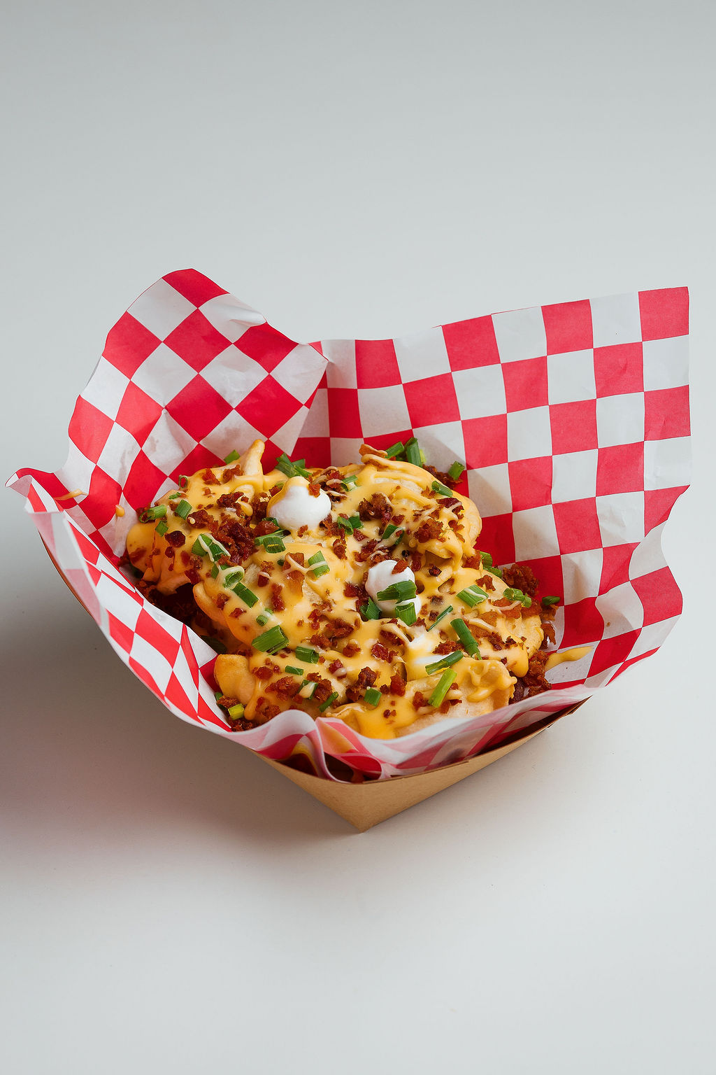 Crispy fried potato & cheese pierogi fully loaded and topped with melty cheese, bacon, sour cream, and fresh chives. All the baked potato vibes.