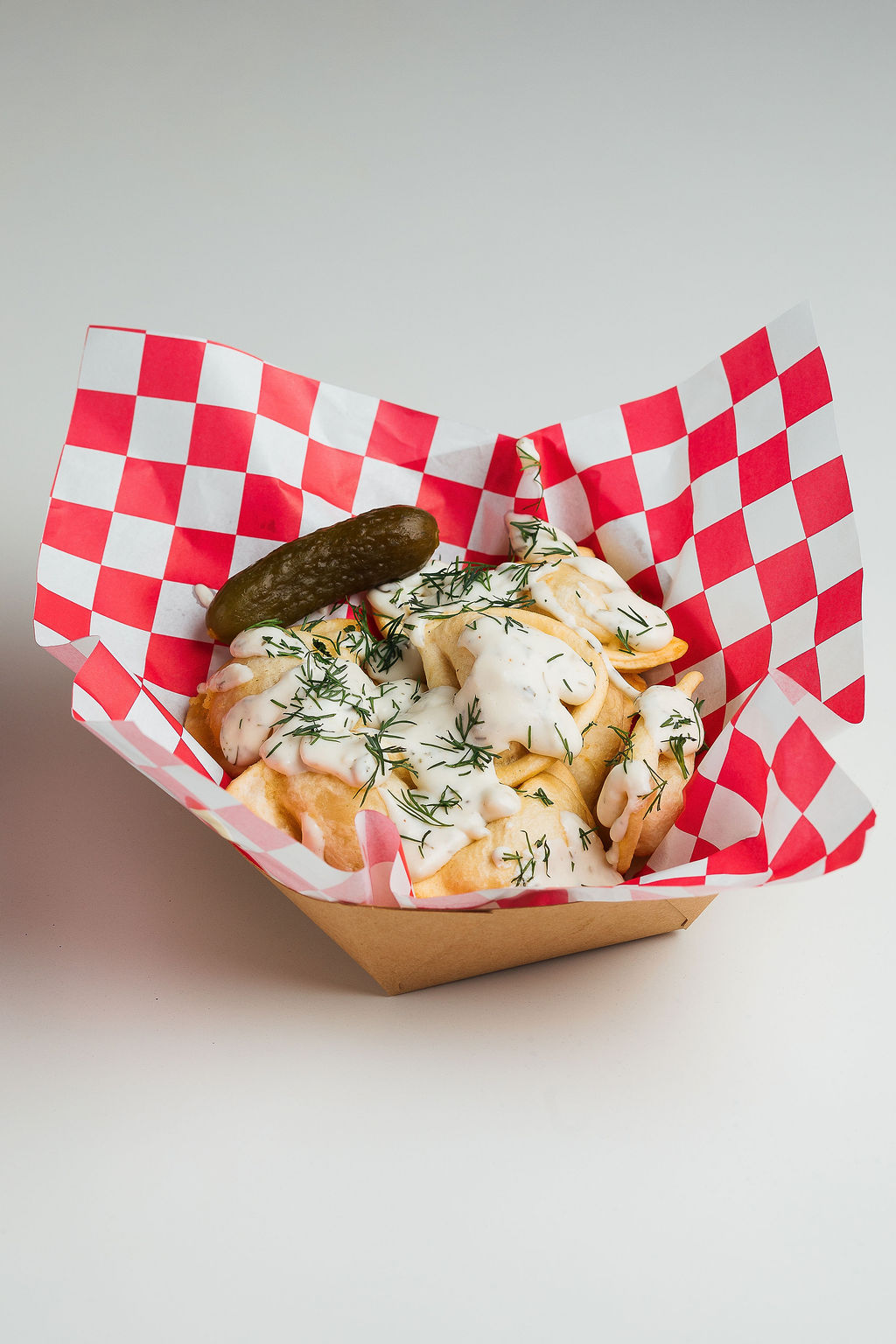 Crispy fried potato & cheese pierogi topped with creamy dill pickle sauce, chopped pickles, and fresh dill. Tangy, cool, and seriously addictive.