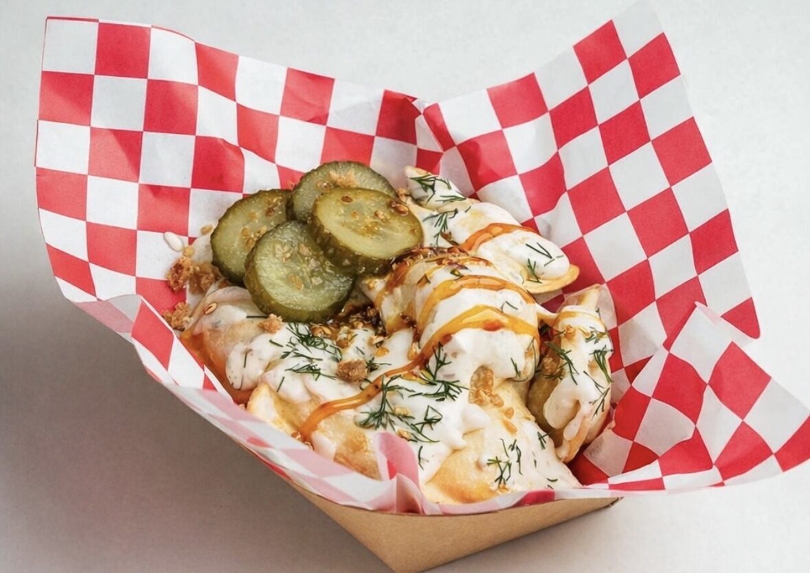 Crispy fried potato & cheese pierogi topped with creamy dill pickle sauce, finished with chopped pickles, crushed crispy fried onions, and a drizzle of hot honey. Tangy, cool, and wildly crave-worthy.